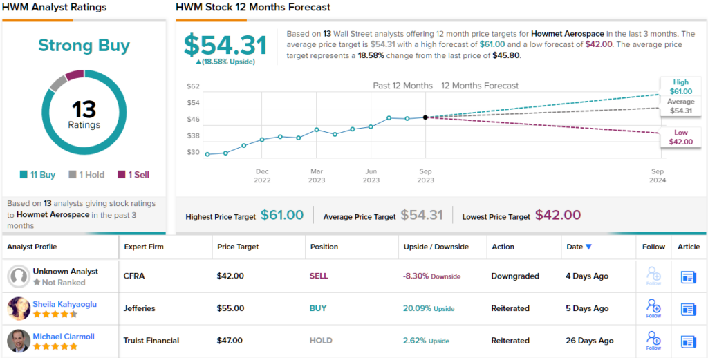 이러한 의견은 HWM에 대한 Liwag의 비중확대(즉, 매수) 등급을 뒷받침하며 그녀의 $60 목표 가격은 12개월 동안 31%의 수익률을 낼 수 있는 여지를 제공합니다. 해당 주식의 Strong Buy 합의 등급은 각각 매수 11건, 보유 및 매도 1건을 기준으로 합니다. 지금으로부터 1년 후 평균 목표 $54.31에 도달하면 주가는 약 19%의 프리미엄으로 바뀔 것입니다.