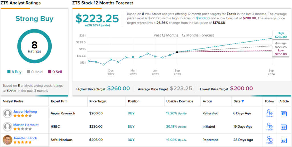 전반적으로 분석가들은 모두 이 일의 뒤에 있습니다. Zoetis는 총 8개의 Buys를 획득하며 모두 자연스럽게 Strong Buy 합의 등급으로 통합됩니다. 평균 목표가 223.25달러라는 점을 고려하면 주가는 연중 26% 상승할 것으로 예상됩니다.