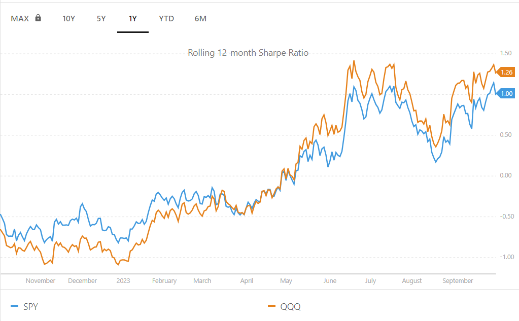 현재 SPY 샤프 비율은 1.00 으로, 이는 QQQ 샤프 비율 1.26 과 대략 같습니다 . 아래 차트는 SPY와 QQQ의 12개월 롤링 샤프 비율을 비교합니다.