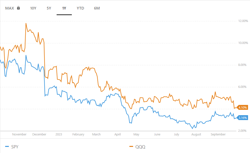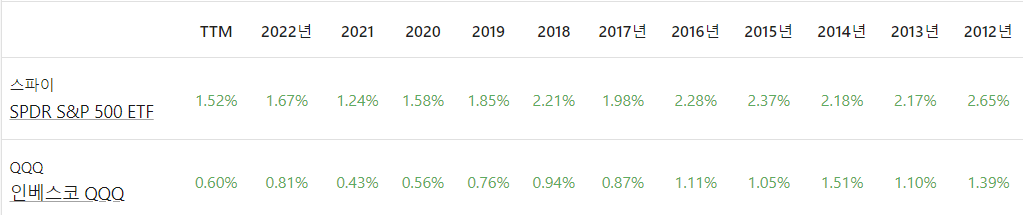 SPY의 향후 12개월 배당수익률은 약 1.52% 로 QQQ의 0.60% 수익률보다 높습니다.