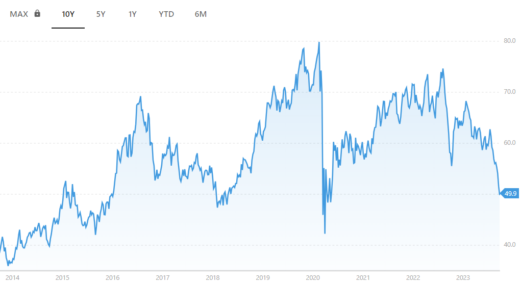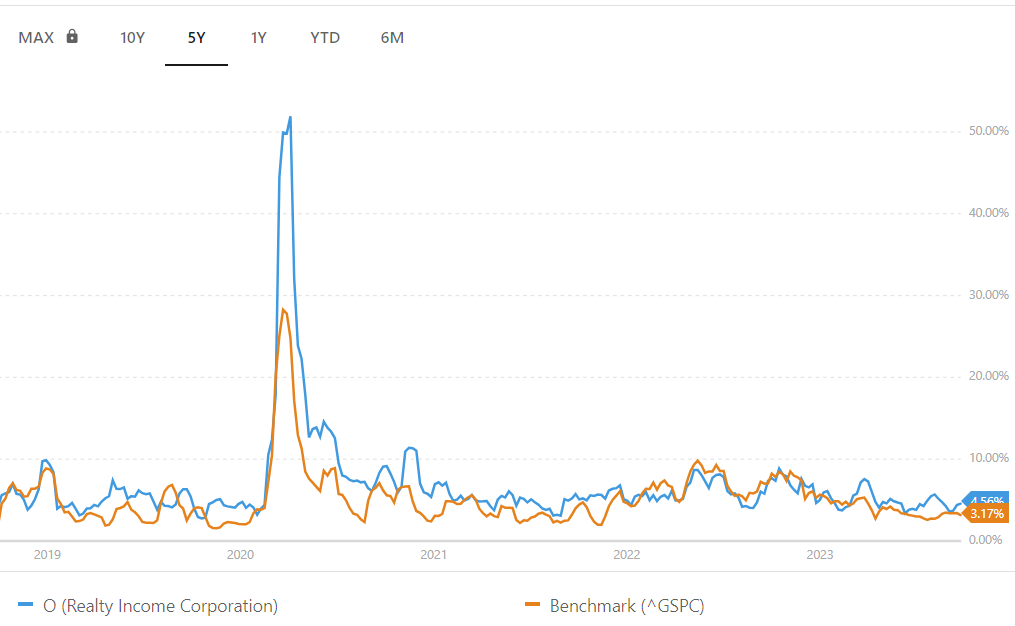 리얼티인컴은 연초 대비 -18.20%(YTD), 지난 12개월 동안 -9.78%의 수익률을 기록했습니다. 지난 10년 동안 리얼티인컴은 연간 7.55%의 수익률을 기록한 반면 S&P 500은 9.78%의 연간 수익률을 기록해 리얼티인컴이 벤치마크만큼 좋은 성과를 내지 못했음을 나타냅니다.