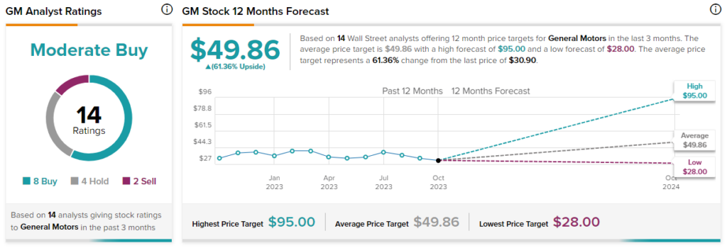 General Motors는 지난 3개월 동안 지정된 8개의 매수, 4개의 보류, 2개의 매도 등급을 기반으로 보통 매수 합의 등급을 가지고 있습니다. $49.86의 평균 General Motors 주가 목표는 61.4%의 상승 잠재력을 의미합니다.