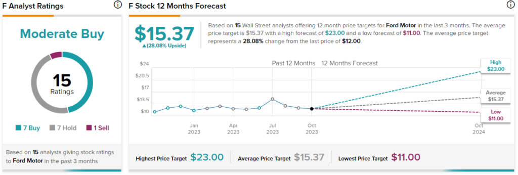 Ford Motor는 지난 3개월 동안 할당된 7개의 매수, 7개의 보류 및 1개의 매도 등급을 기반으로 보통 매수 합의 등급을 보유하고 있습니다. $15.37의 평균 Ford Motor 주가 목표는 28.1%의 상승 잠재력을 의미합니다.