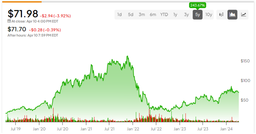 합의에 따르면 Shopify는 2024 회계연도와 2025 회계연도에 각각 11억 9천만 달러와 16억 7천만 달러의 잉여 현금 흐름을 달성할 것으로 예상합니다. 그러나 이는 현재 주가가 올해와 내년 예상 잉여현금흐름의 81배, 58배에 거래되고 있음을 의미한다. P/E 관점에서 Shopify는 올해와 내년 예상 수익의 약 73배와 56배에 거래됩니다.