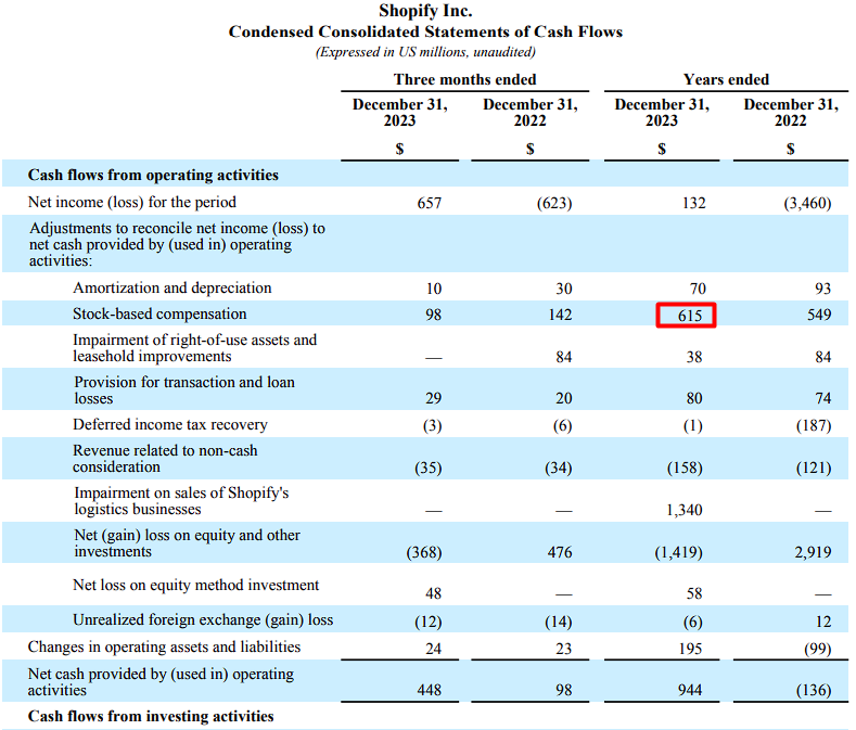 그럼에도 불구하고 특히 Shopify의 풍부한 주식 기반 보상으로 인해 이러한 수치에 주의할 것을 투자자들에게 권하고 싶습니다. 설명하자면, 연간 9억 500만 달러에는 SBC 6억 1500만 달러가 포함됩니다. 많은 투자자들이 이를 무시하는 경향이 있음에도 불구하고 이는 희석성 특성으로 인해 매우 실제적인 비용입니다. 아래를 참조하세요.