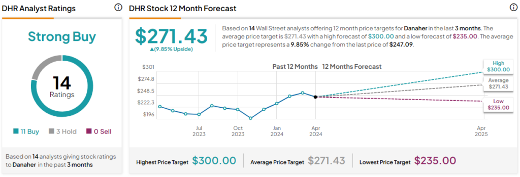 애널리스트에 따르면 DHR 주식은 Strong Buy이며 지난 3개월 동안 11개의 Buy와 3개의 Hold가 할당되었습니다. 평균 DHR 주가 목표인 $271.43은 9.9%의 상승 잠재력을 의미합니다.