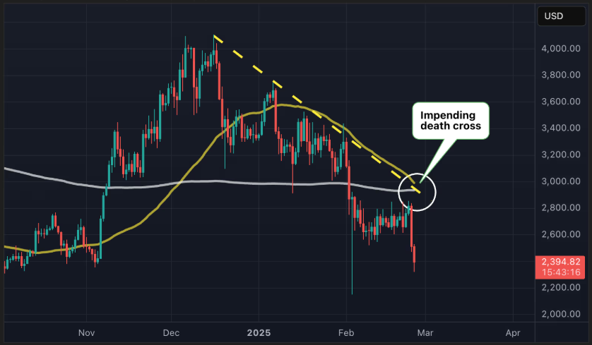 화요일 기준, 이더리움 가격은 5% 이상 하락하며 $2,375를 기록했으며, 50일 SMA가 200일 SMA 아래로 교차할 가능성이 높아졌습니다. 이러한 움직임은 시장에서 추가 하락 압력을 유발할 수 있어 투자자들의 우려를 불러일으키고 있습니다.