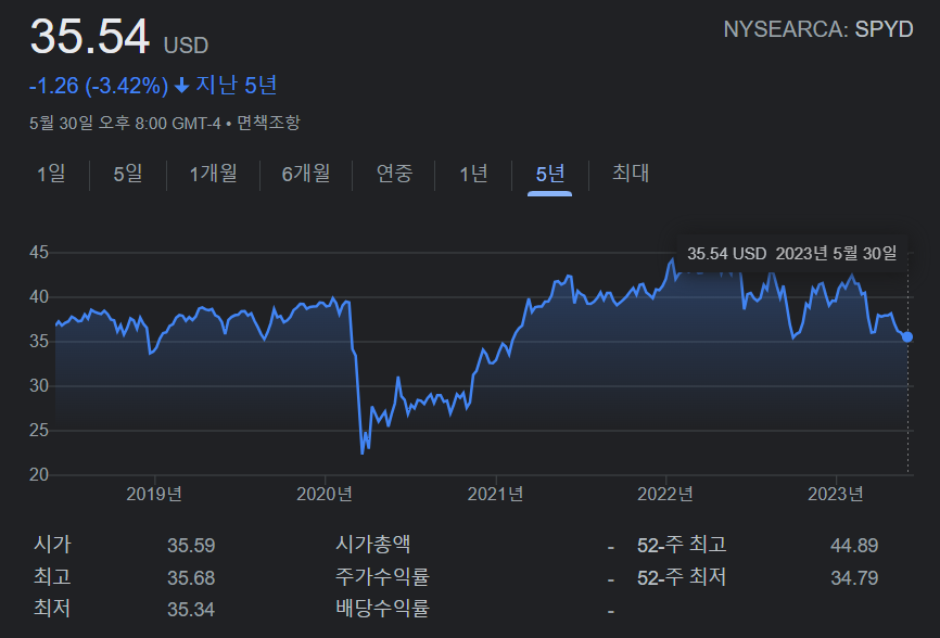 SPYD의 주가 추이를 살펴보면, 상장 이후 약 33% 상승했습니다. 최근 1년간의 주가 상승률은 약 68%로, 코로나19 팬데믹 이후 회복세를 보였습니다.