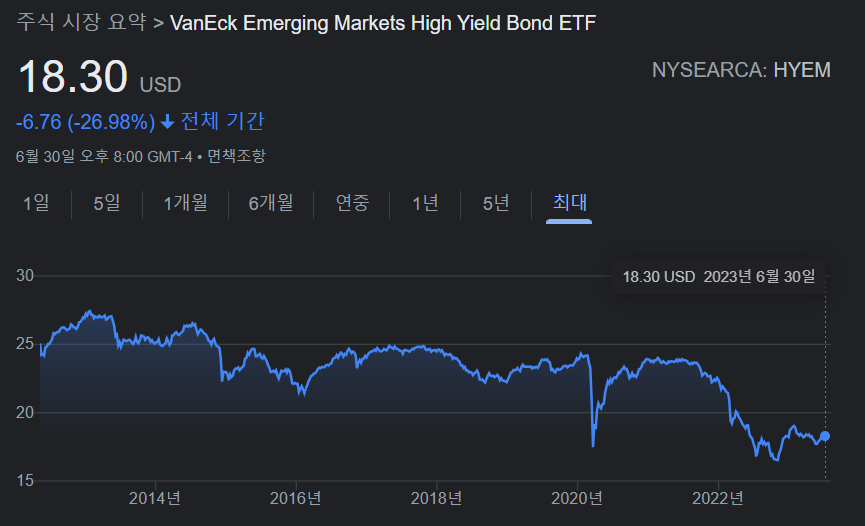 - HYEM은 관리 수수료가 0.4%로 비교적 높으며, 거래량이 낮아 스프레드가 넓을 수 있습니다.