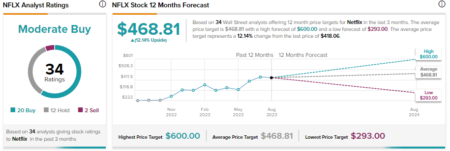 넷플릭스(Netflix)가 올바른 방향으로 나아가고 있지만 경쟁이 심화되고 고객 추가, 가격, 이탈률에 대한 불확실성이 여전히 우려됩니다. 이러한 불확실성을 감안할 때 분석가들은 넷플릭스(Netflix)주식 에 대해 조심스럽게 낙관적인 전망을 유지합니다 . 보통 매수 합의 등급에 대해 매수 20개, 보류 12개, 매도 추천 2개를 받았습니다. 이들 분석가의 12개월 평균 가격 목표인 $468.81은 현재 수준보다 12.14%의 상승 여력이 있음을 의미합니다.