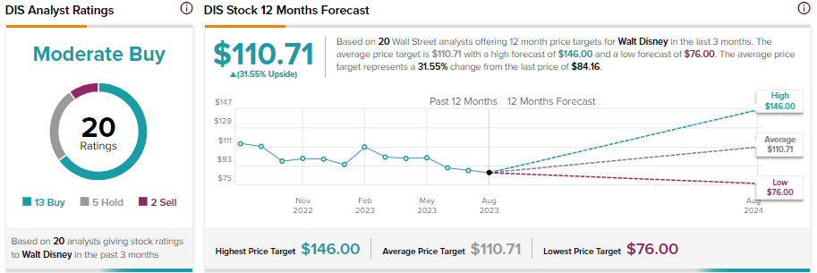 펠츠가 디즈니 경영진과 화해하는 동안 분석가들은 디즈니 주식에 대해 조심스럽게 낙관하고 있습니다. 매수 13건, 보류 5건, 매도 2건으로 디즈니는 보통 매수 합의 등급을 받았습니다. 애널리스트들의 평균 12개월 목표 가격인 $110.71은 현재 수준보다 31.55%의 상승 여력이 있음을 의미합니다.