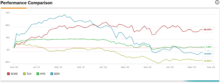 눈에 띄는 12.8%의 수익률을 내는 Global X SuperDividend ETF( NYSEARCA:SDIV ) 와 같은 고수익 주식 ETF와 비교해도 SCHD는 탁월한 옵션입니다. 이러한 막대한 수익률에도 불구하고 SDIV의 장기 수익률은 지난 3년 동안 연간 기준으로 1.4%, 지난 5년 동안 연간 기준으로 9.6%의 손실을 입었기 때문에 실망스럽습니다. 지난 10년 동안 SDIV는 연간 기준으로 2.3%의 손실을 입었습니다.