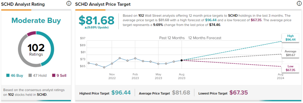 월스트리트를 보면 SCHD는 지난 3개월 동안 할당된 매수 46개, 보유 47개, 매도 등급 9개를 기준으로 보통 매수 합의 등급을 받았습니다. 평균 SCHD 주가 목표인 $81.73은 9.7%의 상승 잠재력을 의미합니다.