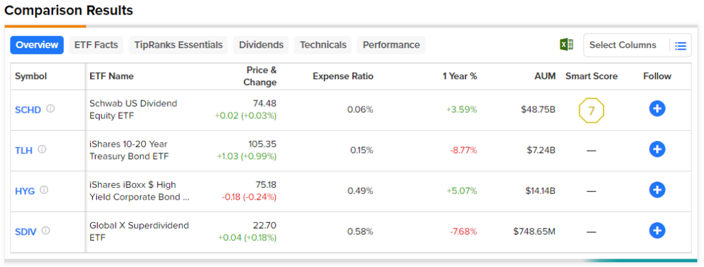 아래에서는 투자자들이 다양한 기준에 따라 최대 20개 ETF를 동시에 비교할 수 있는 TipRank의 ETF 비교 도구를 사용하여 이 4개 ETF 간의 비교를 확인할 수 있습니다 .