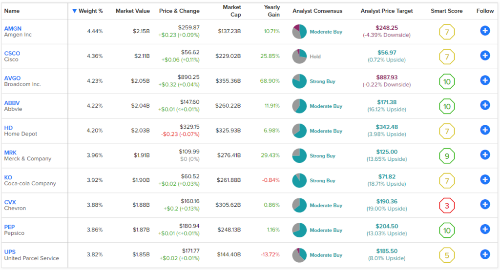 SCHD는 101개 보유로 투자자들에게 견고한 다각화를 제공합니다. 상위 10개 보유 주식이 펀드의 40.9%를 차지합니다. 아래에서 TipRanks의 보유 도구를 사용하여 SCHD의 상위 10개 보유 주식 차트를 확인할 수 있습니다 .