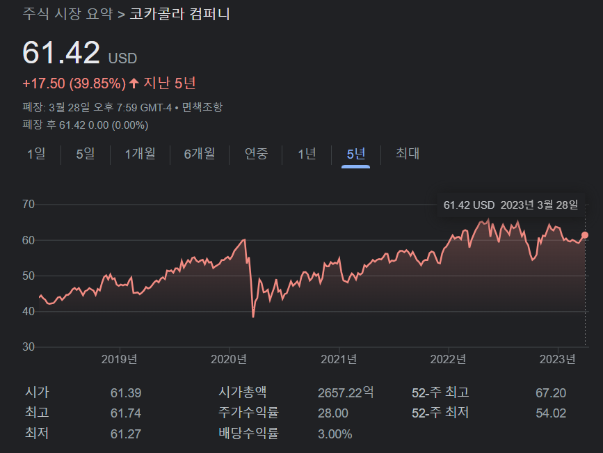 코카콜라의 주가는 2023년 3월 28일 기준으로 주당 61.42달러입니다. 코카콜라는 팬데믹으로 인해 지난해 하락세를 보였지만, 작년부터 점차 회복세를 보여왔고 작년 9월과 10월 사이 하락세를 보인 이후 점차 회복하는 추세에 있습니다.