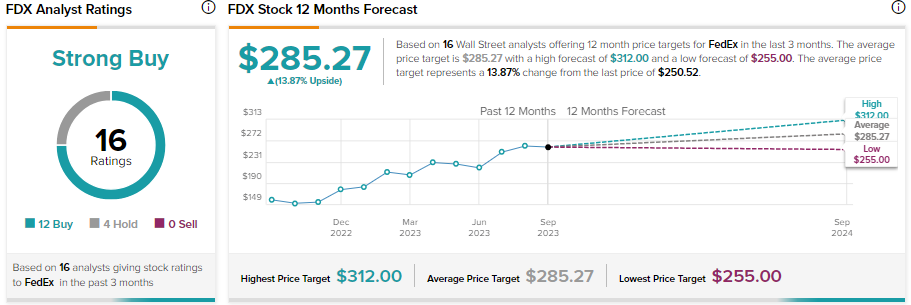 Alliger는 FedEx가 물량 회복과 회사의 비용 절감 노력을 통해 이익을 얻을 것으로 기대하고 있습니다. 또한 분석가는 FedEx의 가치 평가가 "매력적"이라고 생각합니다. Alliger를 포함하여 FedEx 주식에는 12개의 매수 추천이 있습니다. 한편 4명의 애널리스트는 보유를 추천했습니다. 전반적으로 FDX 주식은 강력 매수 추천(Strong Buy) 등급을 받았습니다.