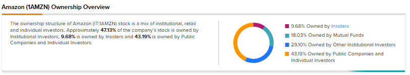 소유권 구조에 따라 AMZN 주식의 47.1%는 기관 투자자가 보유하고 있습니다(뮤추얼 펀드 18%, 기타 기관 투자자 29.1%). 또한 아마존 주식의 43.2%는 개인 투자자가 보유하고 있으며, 그 뒤를 내부자 9.68%가 보유하고 있습니다.
